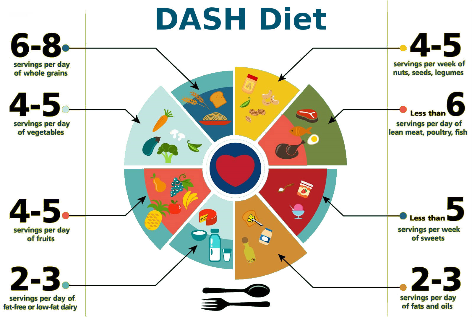 DASH (Dietary Approaches to Stop Hypertension) là chế độ ăn kiêng với những thực phẩm có tác dụng làm giảm huyết áp. Bao gồm các thực phẩm ít chất béo, natri và rượu. Tuân thủ chế độ ăn DASH trong hai tuần có thể làm giảm huyết áp tâm thu của bạn từ 8-14 mmHg. Dưới đây là khẩu phần ăn gợi ý theo chế độ ăn DASH :
